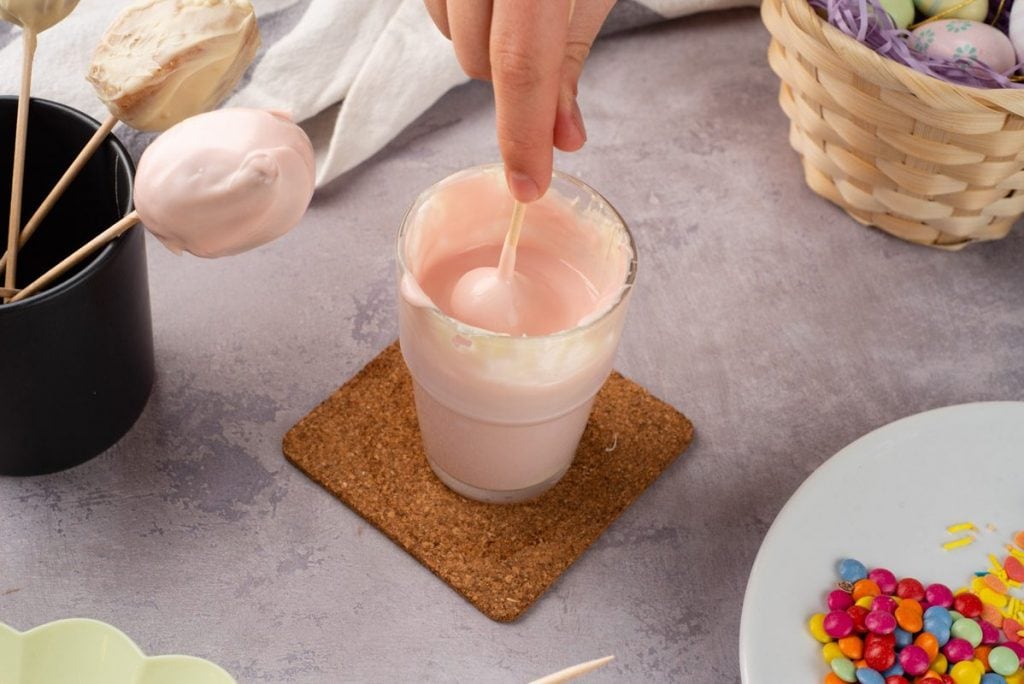 Roztavte cukrový obal v mikrovlnné troubě ve 20sekundových intervalech a mezi jednotlivými intervaly míchejte. Vezměte dvě sklenice: do obou nalijte rozpuštěný bonbónový kabátek a jednu obarvěte růžovým potravinářským barvivem. Ponořte každou tyčinku do cukrové taveniny. Každé dortové vejce napíchněte špejlí dortovou tyčinkou.