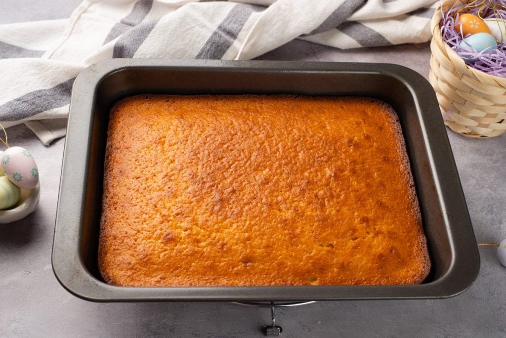 Udělejte a upečte dort podle návodu na krabičce. Vyjměte pekáč z trouby a nechte vychladnout.