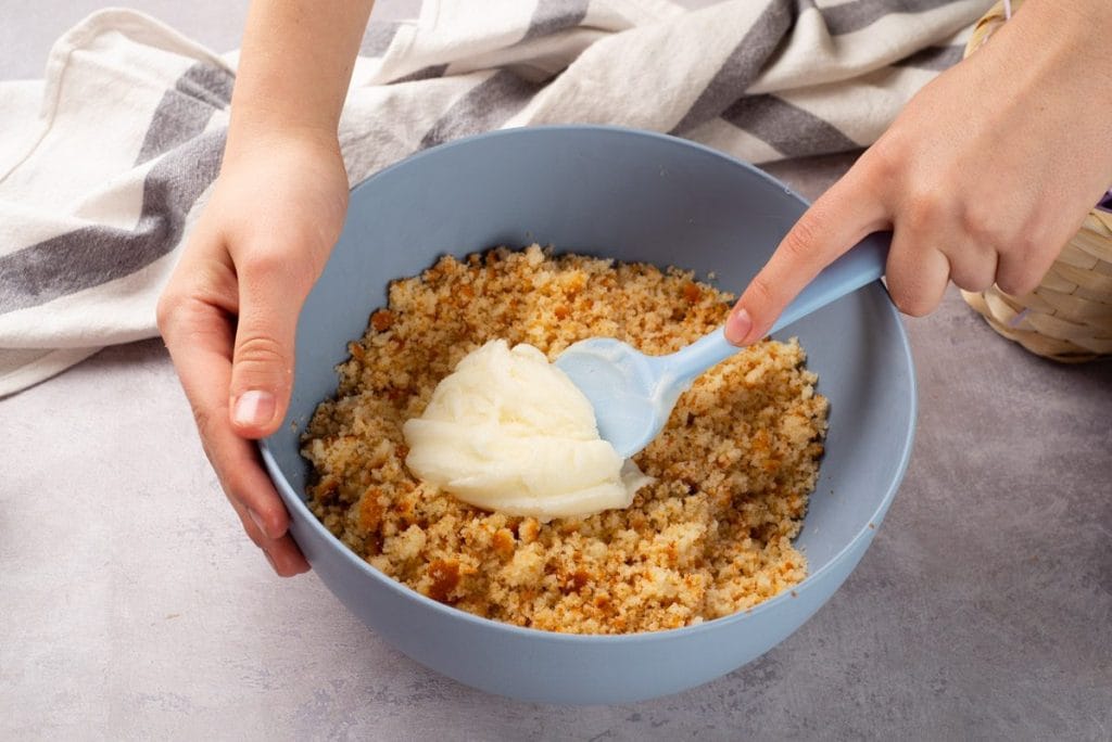 Vmíchejte 2/3 polevy do drobenky, dokud se směs nedá tvarovat.