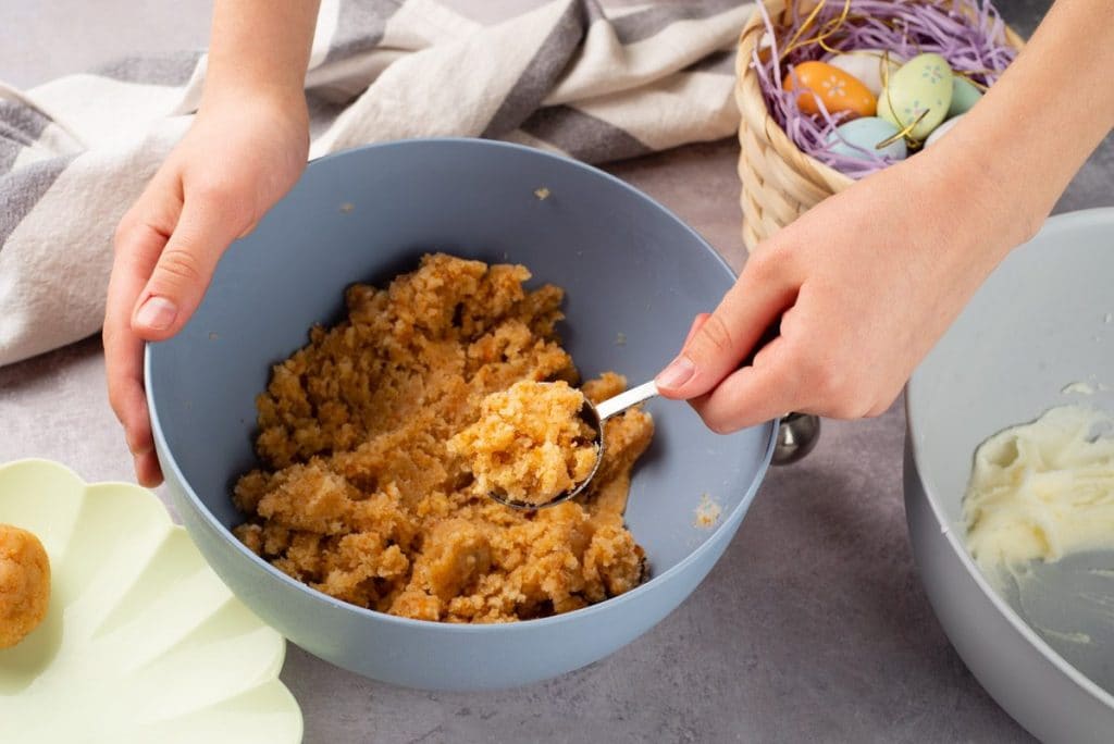 Naberte jednu polévkovou lžíci dortové směsi do ruky.