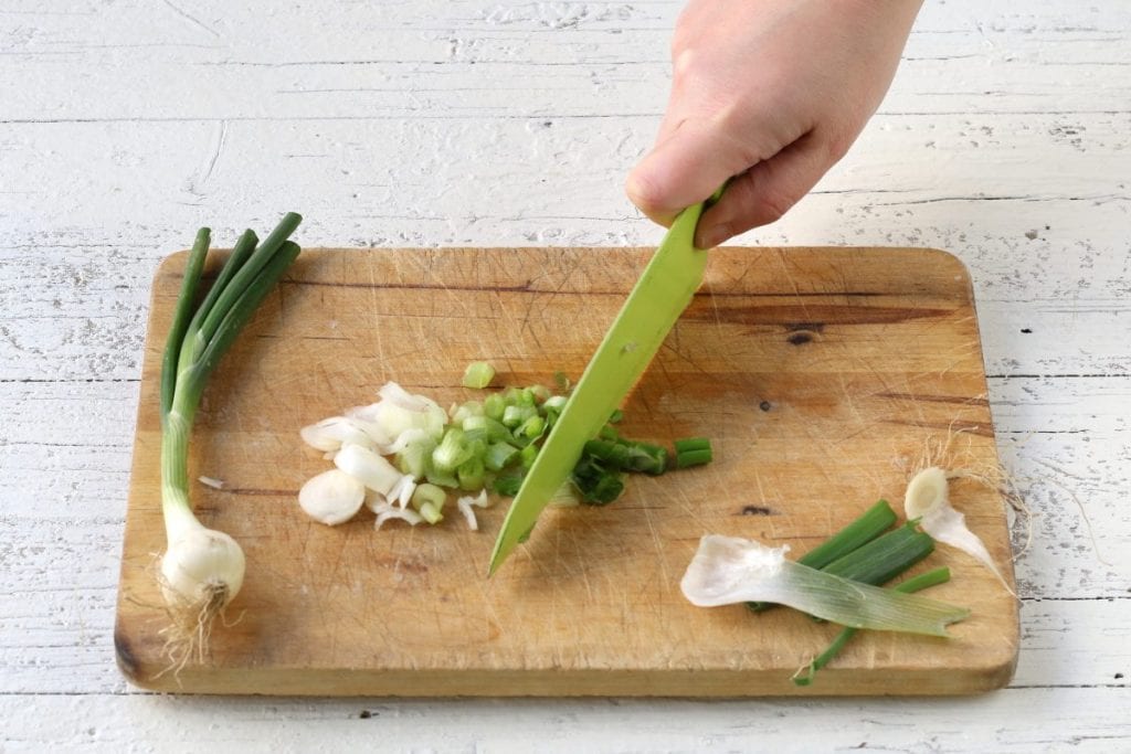 Jarní cibulky oloupeme a nakrájíme nadrobno1. Poté je nasbírejte na pánev a nechte je oschnout pokapaným olejem.