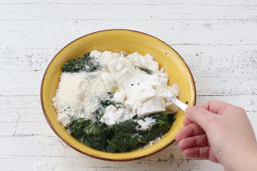 Uvařený špenát shromážděte do čisté misky spolu s parmazánem a ricottou3. Promícháme a necháme stranou.