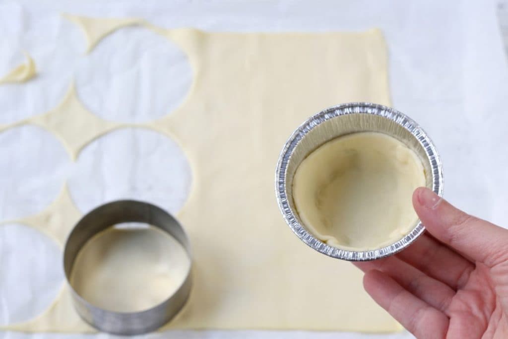 Pomocí vykrajovátka na cukroví o průměru 8 cm nakrájejte 12 koleček a použijte je jako základ vložením do hliníkových pečicích košíčků nebo formiček na muffiny.4. Formičky položte na plech do trouby.