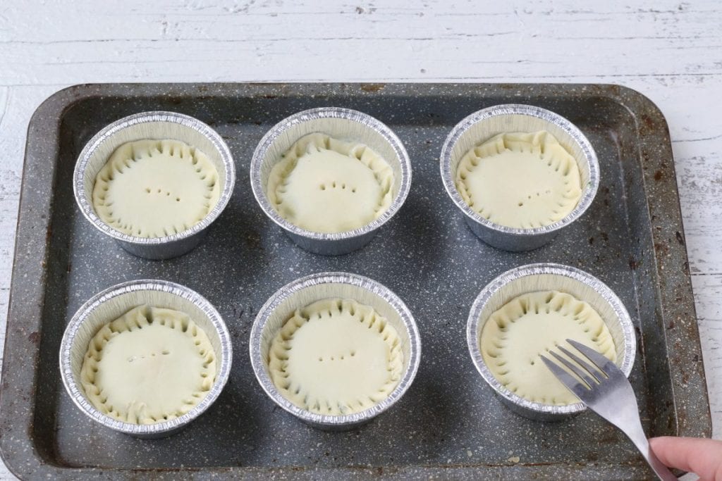 Nakrájejte 12 kotoučů o průměru 6 cm a umístěte je jako pokličky na každý dort. Okraje utěsněte stlačením vidlicemi a povrch pouze jednou propíchněte7. Víčka potřeme rozšlehaným žloutkem s kapkou mléka a pečeme v předehřáté statické troubě na 200 °C asi 25 minut, přičemž sledujeme stupeň zhnědnutí. Vyjměte z trouby, nechte vychladnout a opatrně vyklopte. Poté podávejte minipaskvaliny teplé nebo horké.