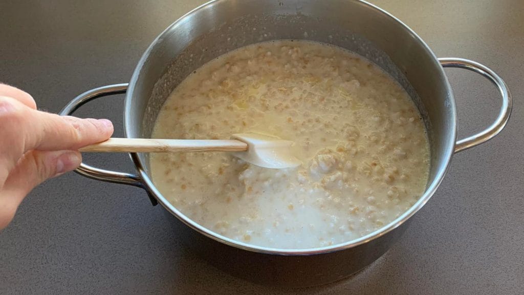 Mezitím se věnujte náplni, začněte pšeničnou smetanou. Předvařenou pšenici dobře sceďte v cedníku, abyste odstranili konzervační tekutinu4, poté přendejte do hrnce spolu s mlékem, máslem a pomerančovou a citronovou kůrou.