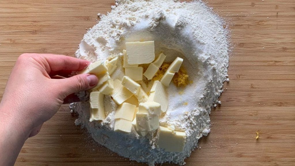 Začněte připravovat neapolské pastiera z křehkého těsta: prosátou mouku s práškem do pečiva nasypte do fontány na pracovní plochu a přidejte měkké máslo nakrájené na malé kousky, do středu cukr a nastrouhanou citronovou kůru1.