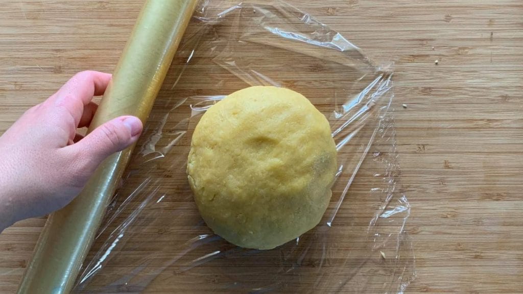 Jakmile se ingredience promísí, bude těsto lehce lepivé: několik sekund ho hněťte s velmi malým množstvím mouky, abyste získali pevné a homogenní těsto. Poté vytvořte kouli, zabalte ji do průhledné fólie3a dáme na hodinu odpočinout do lednice.