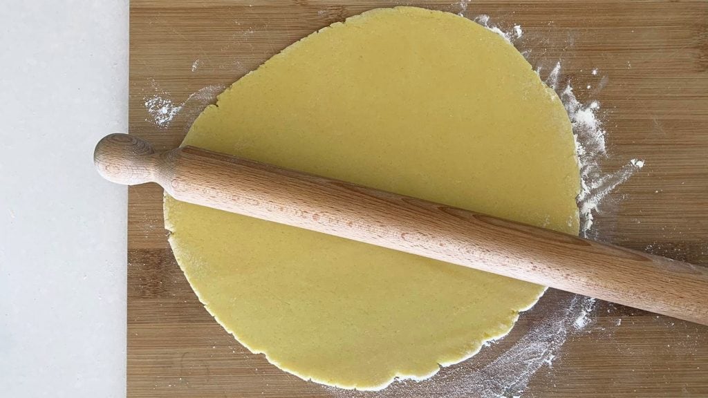 Pomocí válečku přeneste křehké těsto do hliníkové formy o průměru 24 cm. Stále pomocí válečku odstraňte přebytečné těsto z okrajů a poté je ořízněte nožem, abyste je vyrovnalijedenáct. Nakonec základnu propíchejte vidličkou.