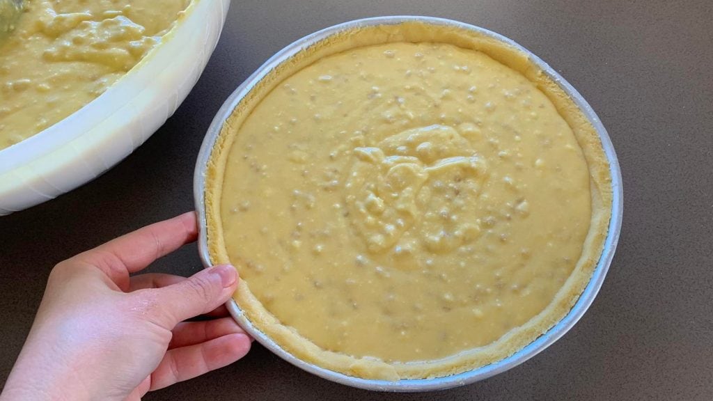 Poté naběračkou nalijte náplň, zastavte pár milimetrů od okraje12: při vaření má pastiera tendenci bobtnat a tato malá předvídavost zajistí, že náplň nevyteče.