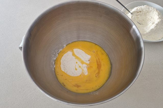 Kvásek přendejte do mísy planetového mixéru, přidejte 3 lžíce mouky6a krátce pracujte s bičíky.