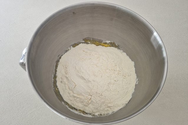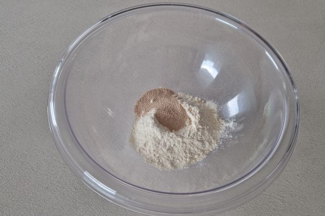 Nejprve si připravte kvásek: do mísy shromážděte prosátou manitobovou mouku a dehydrované pivovarské kvasnice1.